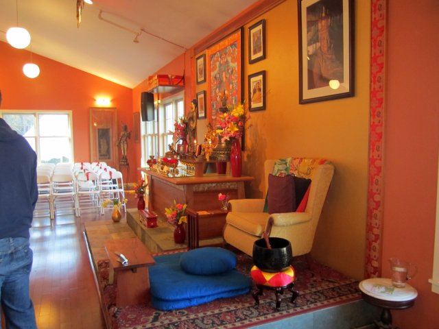 We got back to the lodge and decided to go out for seafood, I believe the name of the restaurant is Holly Mackerel. We walked in and saw a woman at the counter who looked familar, we asked if she went to the Pema retreat, she said she did. We invited her to join us and she said yes. Her name was Susan. It is so strange, after I had gotten home I realized before meeting her in the restaurant, I had taken a photo of her in front of the Buddha in the shrine. We did not sit by her I just snapped a photo and she was in it. We had a lovely dinner, and returned to the lodge. Greg and I decided that we would leave a bit earlier than we did this morning, we wanted good seats. I would have to follow her to the school because she was leaving straight from the school to drive home to Ottawa.