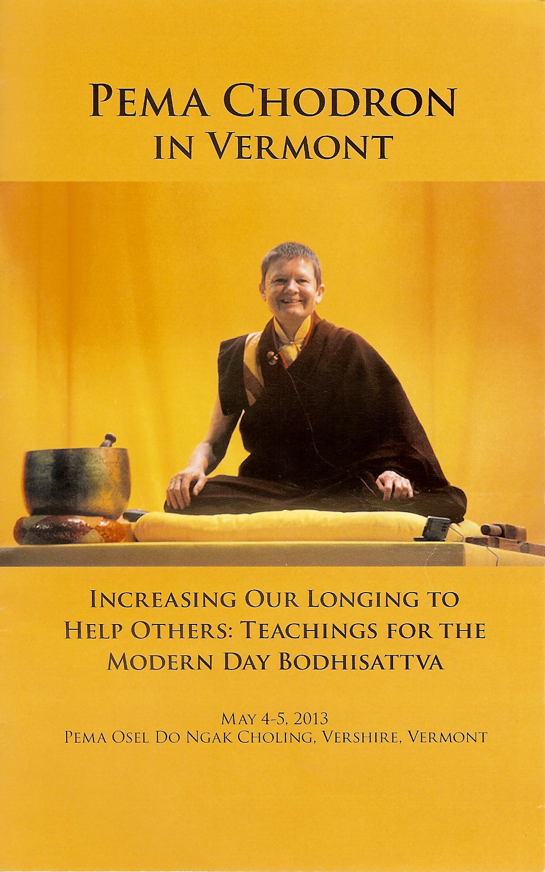 For my birthday this year Mike gave me a gift to go to a retreat in Vermont to hear Pema Chodron, a Buddhist nun, speak about the teachings of Shantideva (a famous scholar and yogi of India in the 8th century) on ways of the Bodhisattva. I can hear you now; what is a Bodhisattva? In Mahayana Buddhism (Tibetian) the Bodhisattva postpones attainment of Nirvana in order to alleviate the sufferening of others. They choose to come back life after life (even though they have achieved enlightenment) to help those in need. Mother Theresa, and/or Ghandi (people who help others for no gain of their own) would be considered a Bodhisattva.