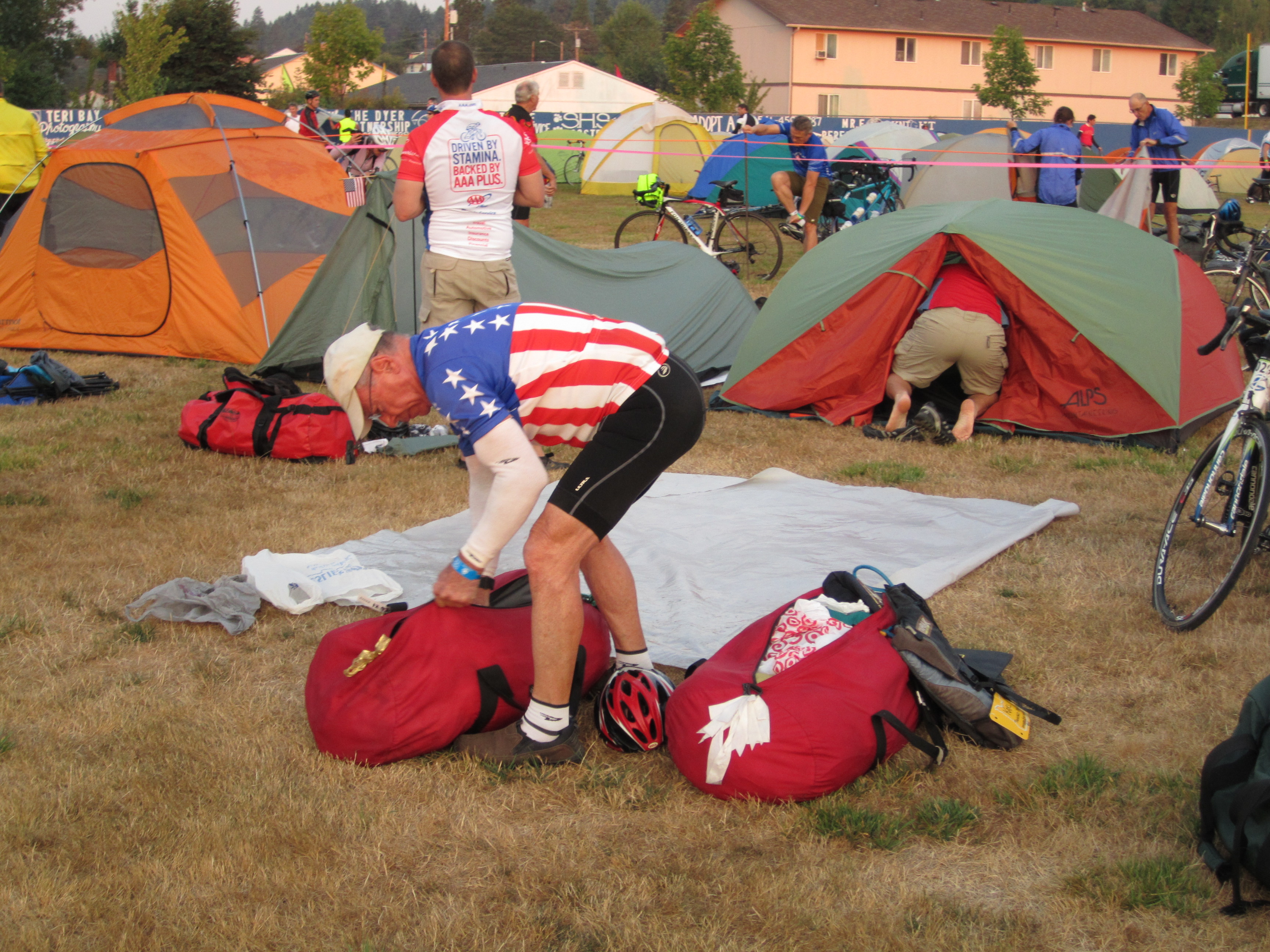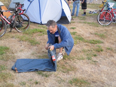 Willy, already showered, ready to ride Rachelle and Scott packing up