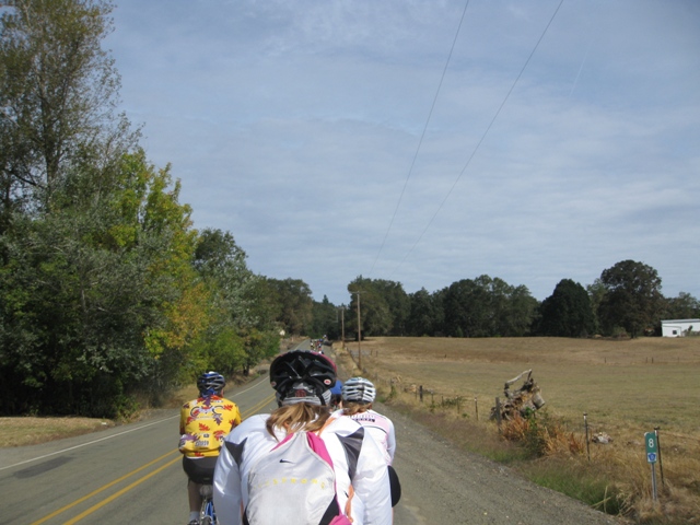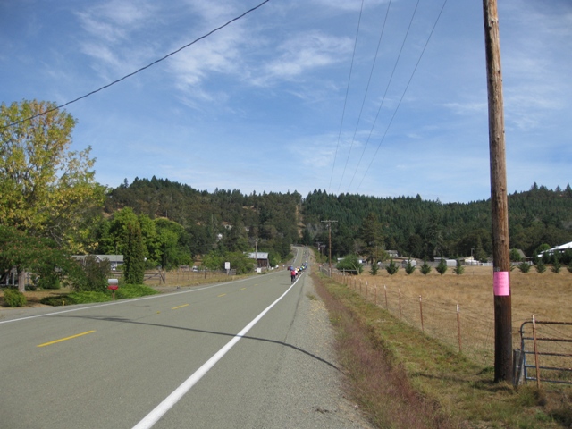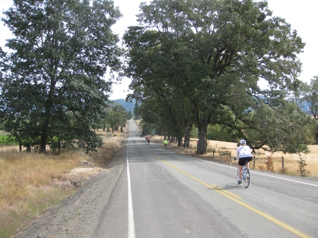 The ride into the town of Riddle was mostly flat but we fought a head wind. We bypassed the 54 mile rest stop because it was too crowded. We stopped later by the side of the road