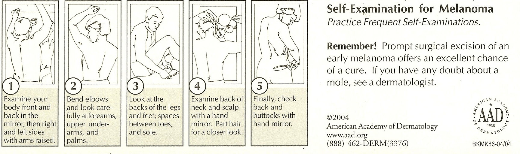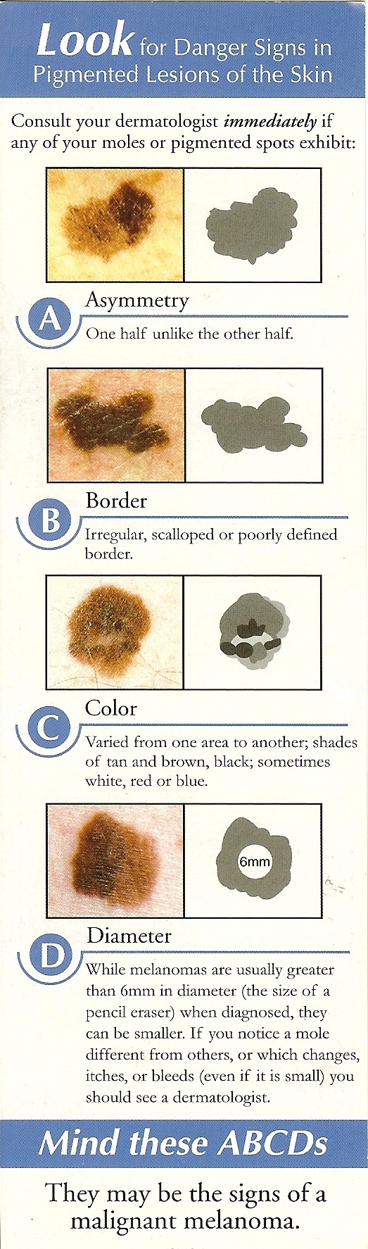 Early signs of melanoma are changes to the shape or color of existing moles or, in the case of nodular melanoma, the appearance of a new lump anywhere on the skin (such lesions should be referred without delay to a dermatologist). At later stages, the mole may itch, ulcerate or bleed.[5] Early signs of melanoma are summarized by the mnemonic "ABCDE":