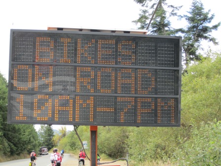After lunch our route turned onto Hwy 242, where we came upon the "Bikes on Road" sign below. Good thing, because there were a lot of lumber trucks on this road.