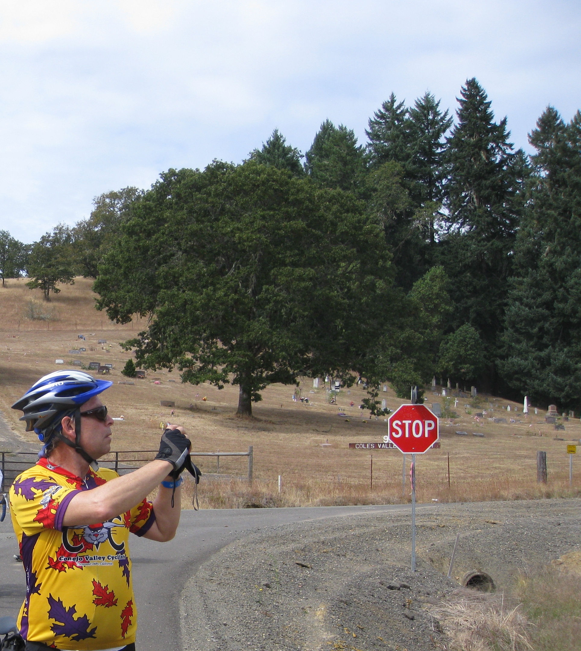 Taking it easy after the climb Mike taking a picture of the beautiful country side, Coles Cemetary is in the back ground.